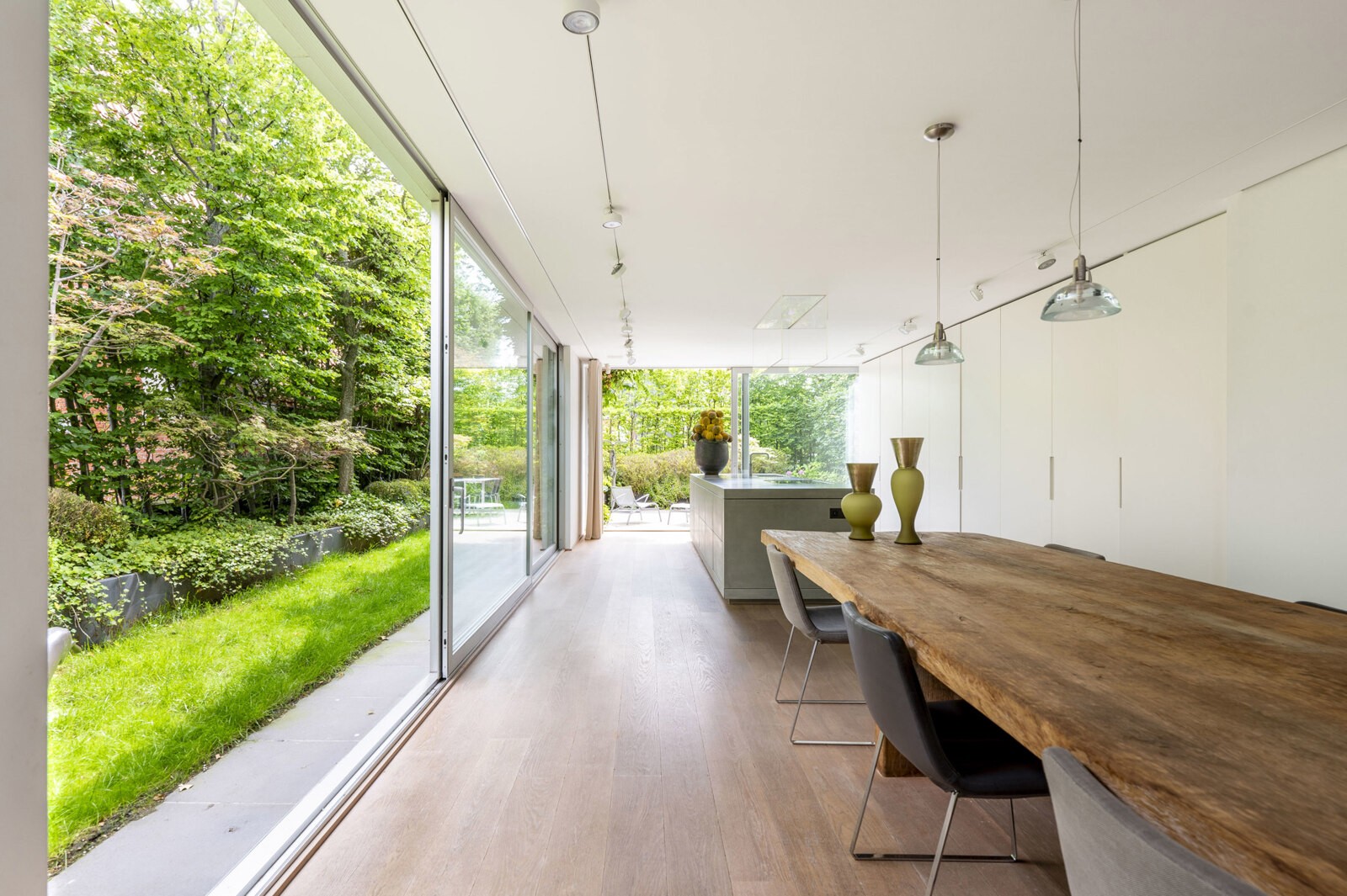 The kitchen is equipped with a huge kitchen island and features spacious cabinets, adjacent to a garden and terrace with sliding doors, creating a seamless transition between inside and outside. The dining room is located next to the kitchen island.