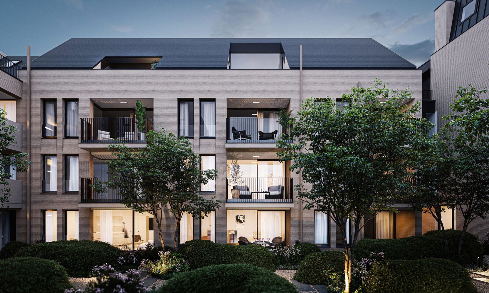 High-quality apartments surrounding an enchanting city garden. A harmonious combination of urban dynamism and blissful tranquility. The project consists of 32 apartments spread across three buildings, creating a small-scale and secure atmosphere. The architecture by Verhamme De Vel gives the whole a strong character, inspired by the historic surroundings. The division into residential volumes on a human scale gives the project an intimate feel. The garden and landscape architecture by Koen Aerts (Archi-verde) creates a layered interplay of green hedges and transparent tree crowns: a beautiful, green courtyard garden — a rare luxury in the city. What's more, the project is extremely sustainable and future-proof, with an E-level below 20 and completely fossil-free. Parking and storage available. Purchase under 6% possible, as well as 100% exemption from property tax for 5 years.