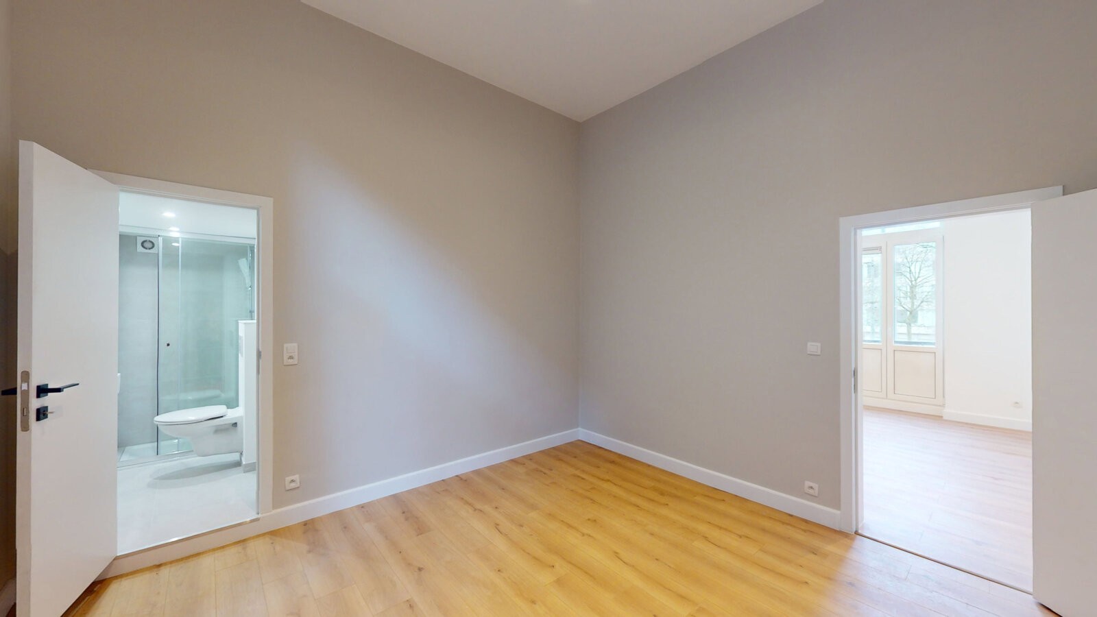 De royale slaapkamer van ca. 22 m² is rustig gelegen aan de achterkant van het kleinschalig gebouw en biedt toegang tot een fijne badkamer uitgerust met een douche en toilet.