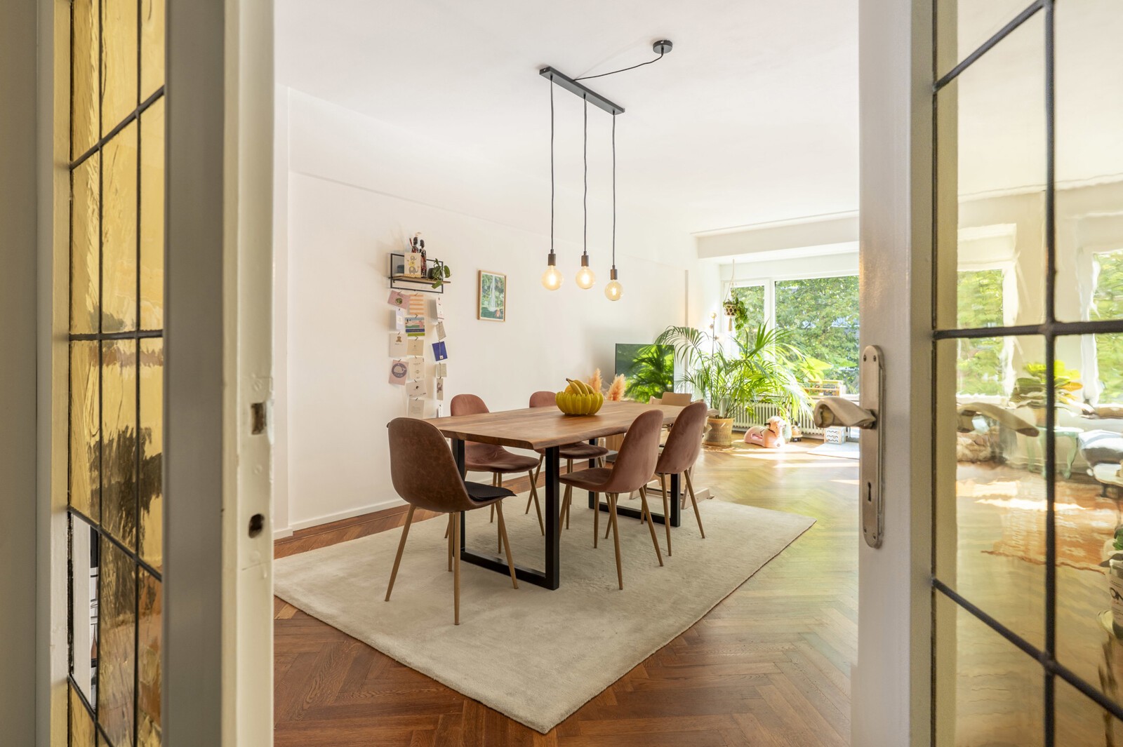 Bij het betreden van het appartement komt u binnen in de inkomhal met ingemaakte vestiarekast en separaat toilet, die toegang geeft tot de royale leefruimte en eetplaats. De zeer ruime leefruimte aan de voorzijde wordt gekenmerkt door authentieke parketvloeren en grote raampartijen die zorgen voor een overvloed aan licht en een aangenaam zicht op het groen. Gezelligheid troef: de zithoek biedt plaats voor een ruim salon en eettafel, ideaal voor diners en gezellige avonden met gasten.De open keuken, volledig geïnstalleerd en praktisch ingedeeld, staat in connectie met leefruimte en geeft toegang tot een terras — handig in gebruik, onder meer voor het plaatsen van vuilniszakken.