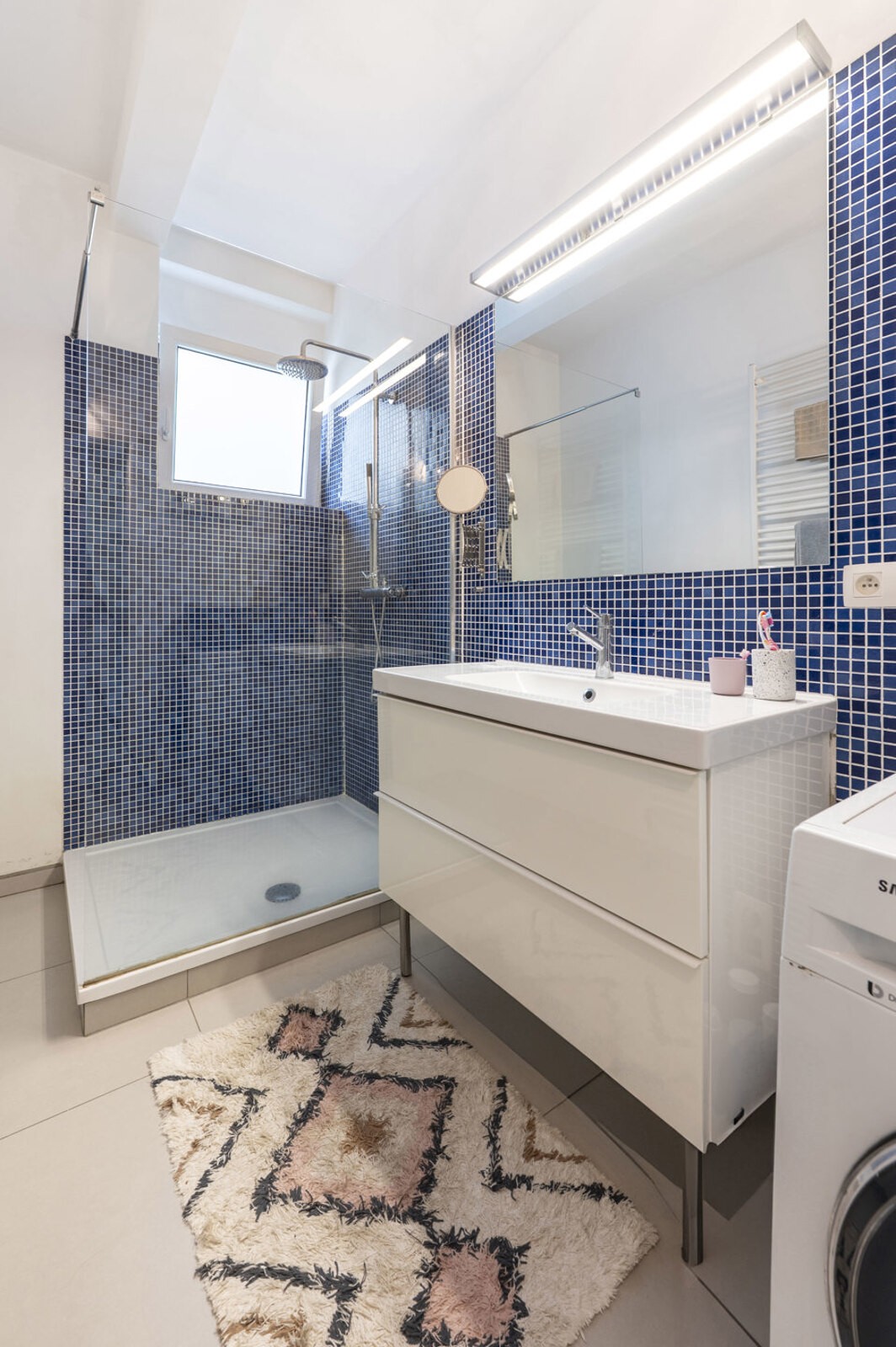 Via de nachthal bereikt u de twee volwaardige slaapkamers aan de achterzijde van het appartement. De master bedroom is bijzonder ruim, baadt in het licht en geeft toegang tot een zalig Zuid-West georiënteerd terras met vrij zicht. Daarnaast is er een tweede ruime slaapkamer, momenteel ingericht als kinderkamer. Tot slot beschikt het appartement over een verzorgde badkamer met een inloopdouche.