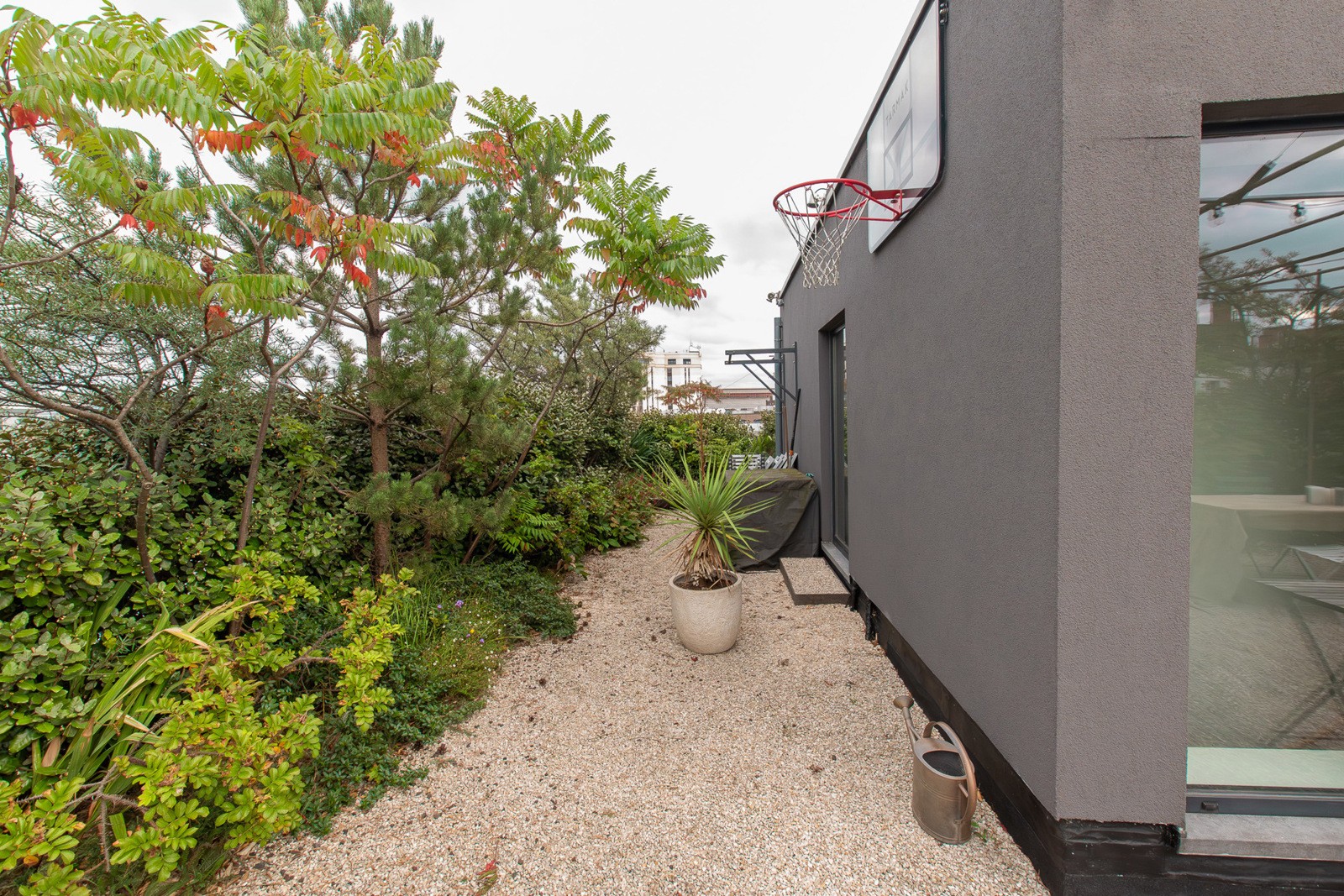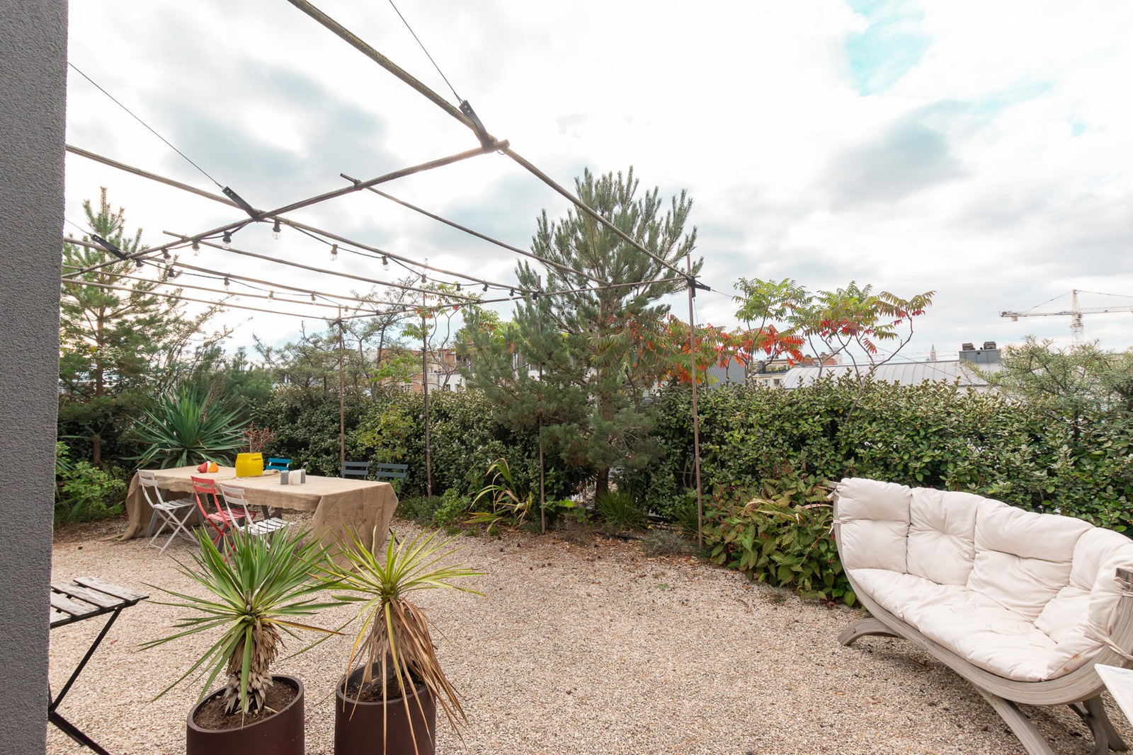 Een trap brengt u naar de zevende verdieping, waar zich momenteel een bureau, zomerkeuken en extra sanitair bevinden. Deze ruimte kan eenvoudig dienstdoen als derde slaapkamer. Absolute blikvanger is echter de uitzonderlijke daktuin van 172 m², uitgerust met een gasleiding voor barbecue, een automatisch sproeisysteem en een nieuw dak (2021). Hier geniet u zorgeloos van een oase van rust midden in de stad.