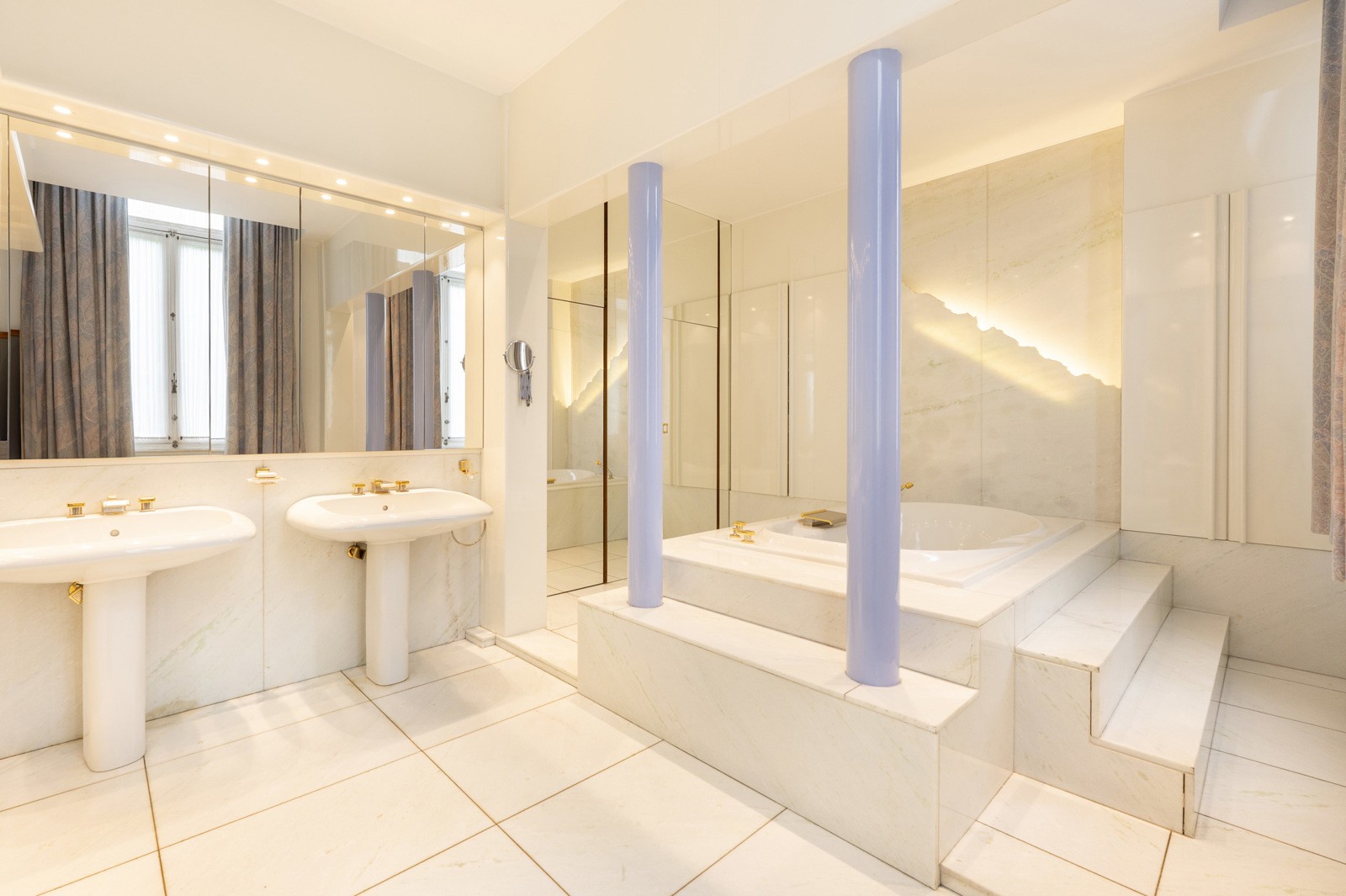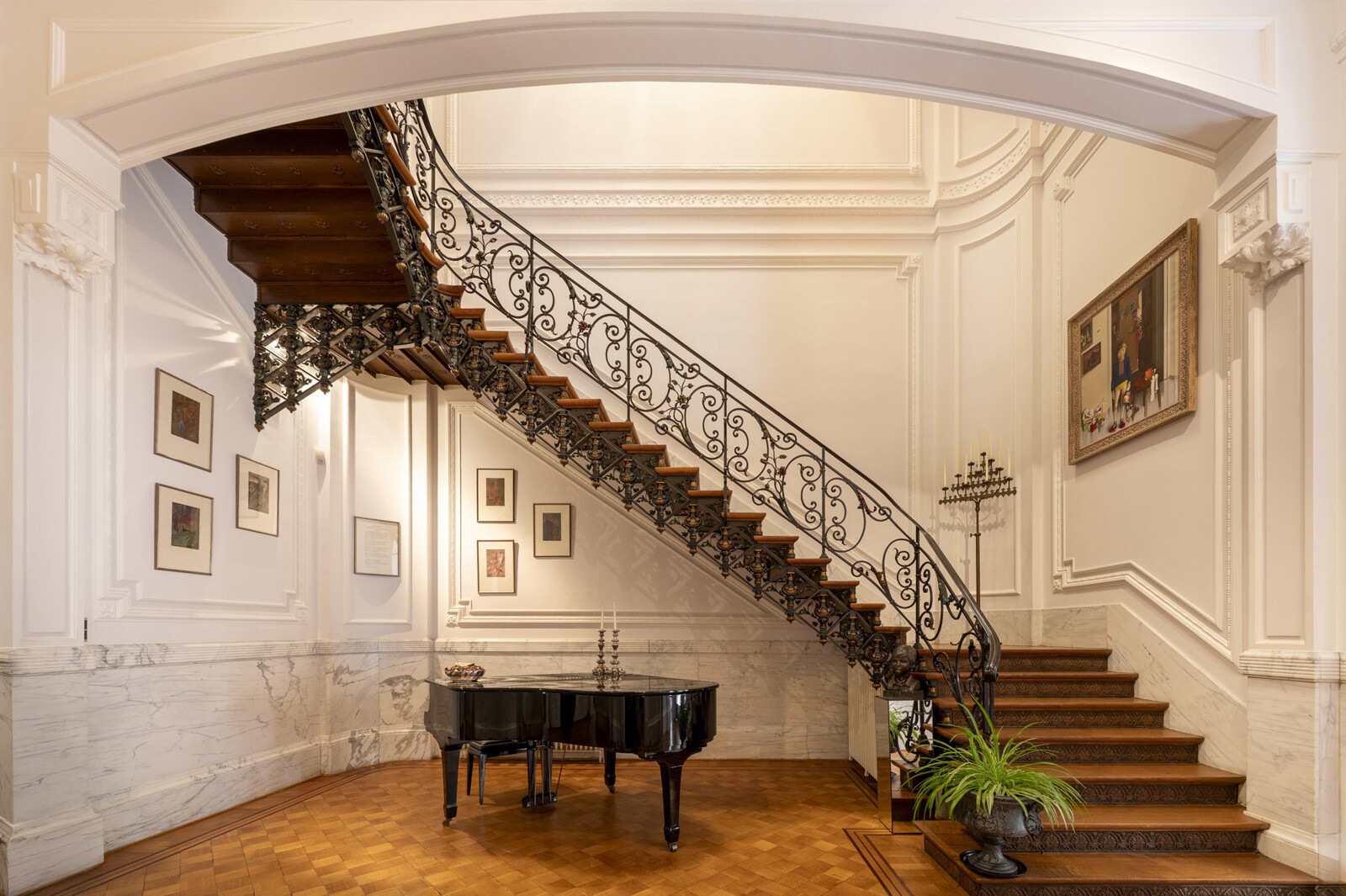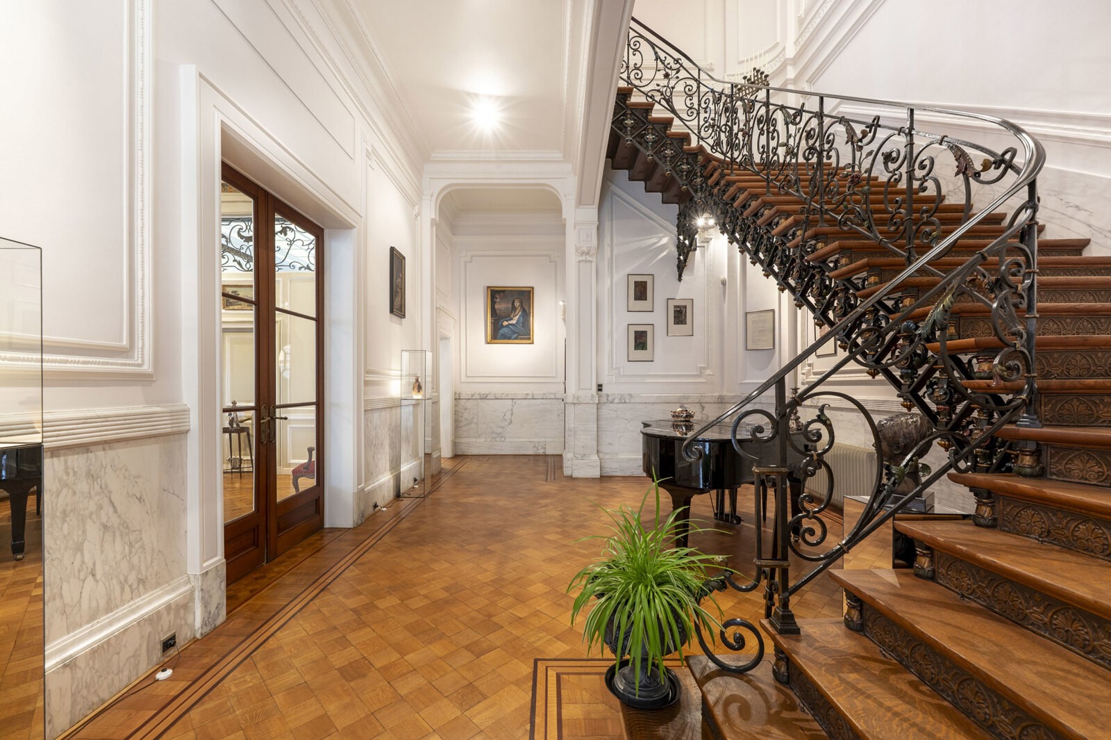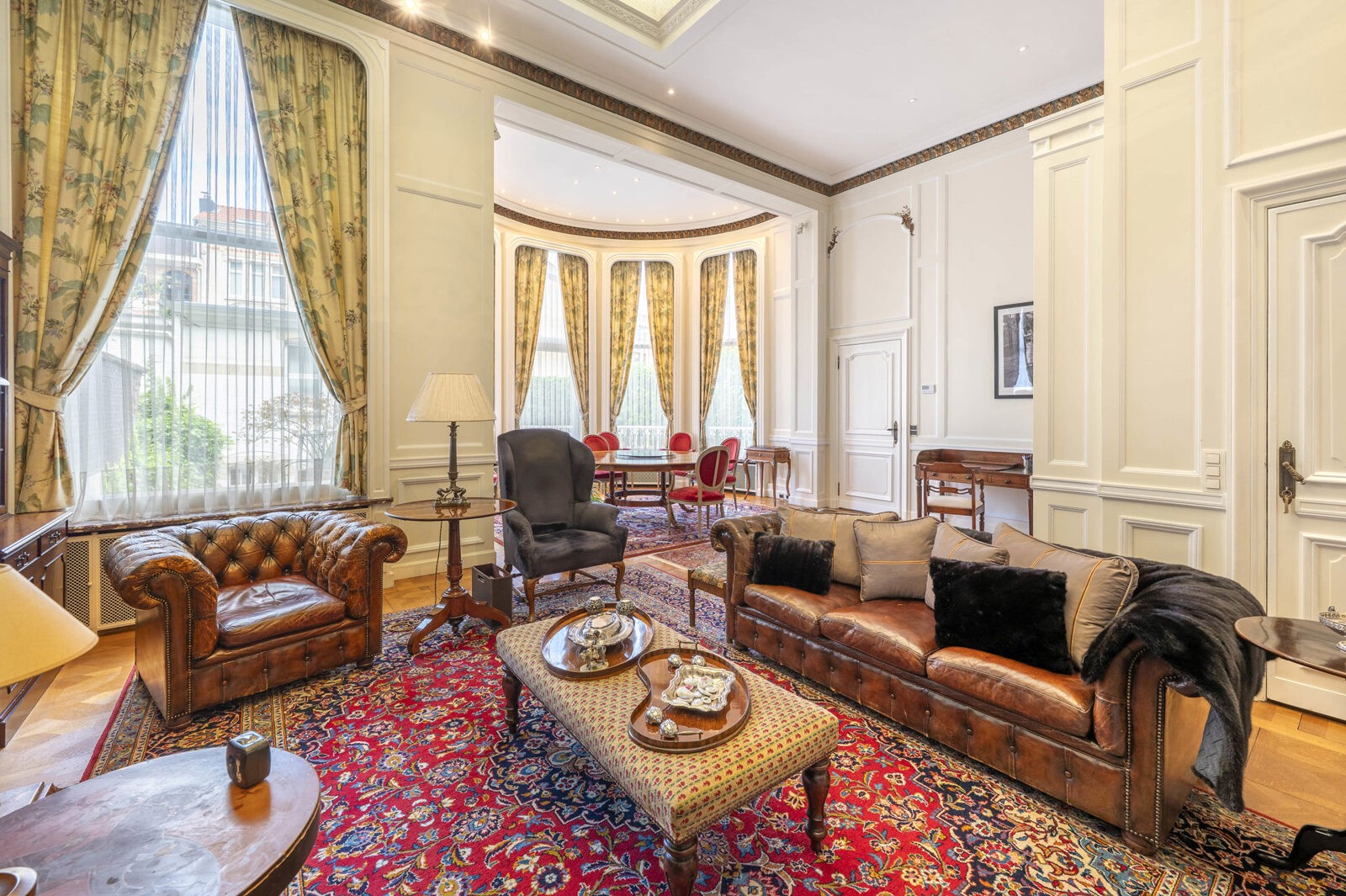 Het ontvangstsalon en zitkamer heeft rijkelijk versierde hoge plafonds en origineel schrijnwerk. Vervolgens een salon met formele eetkamer in de erker met uitzicht op de tuin. De keuken is voorzien van de gebruikelijke toestellen.