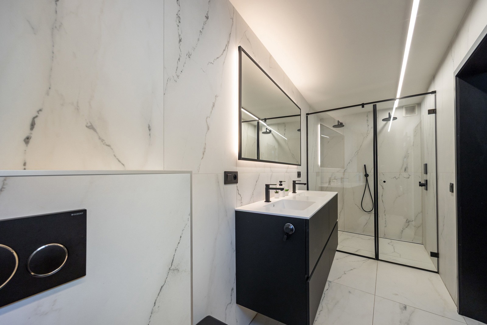 De open keuken is volledig uitgerust met hoogwaardige toestellen en sluit aan op een handige bijkeuken/wasplaats. Vanuit de leefruimte bereikt u het eerste zonnige terras – perfect voor een ontbijt in de zon of een ontspannen aperitiefmoment.