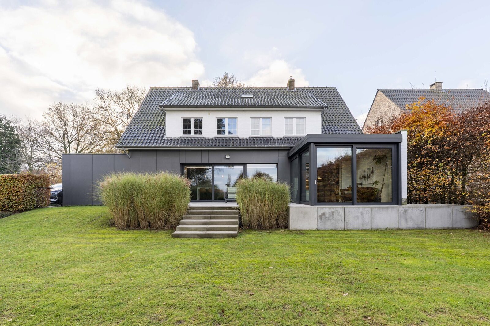 Bij binnenkomst word je verwelkomd in een ruime inkomhal met gastentoilet. Het gezellige salon met sfeervolle gashaard nodigt uit tot ontspannen avonden. De royale leefkeuken is een echte eyecatcher: uitgerust met een uitgebreid gamma van de nieuwste toestellen, waaronder een oven, stoomoven, ingebouwde koffiemachine, warmhoudlade en vacuümlade. Het stijlvolle kookeiland en het prachtige uitzicht op de tuin maken koken hier een waar genot. Via de grote ramen geniet je van veel lichtinval en directe toegang tot het ruime terras – ideaal voor buiten dineren. De lichte veranda vormt een heerlijke plek om elk seizoen van de tuin te genieten.