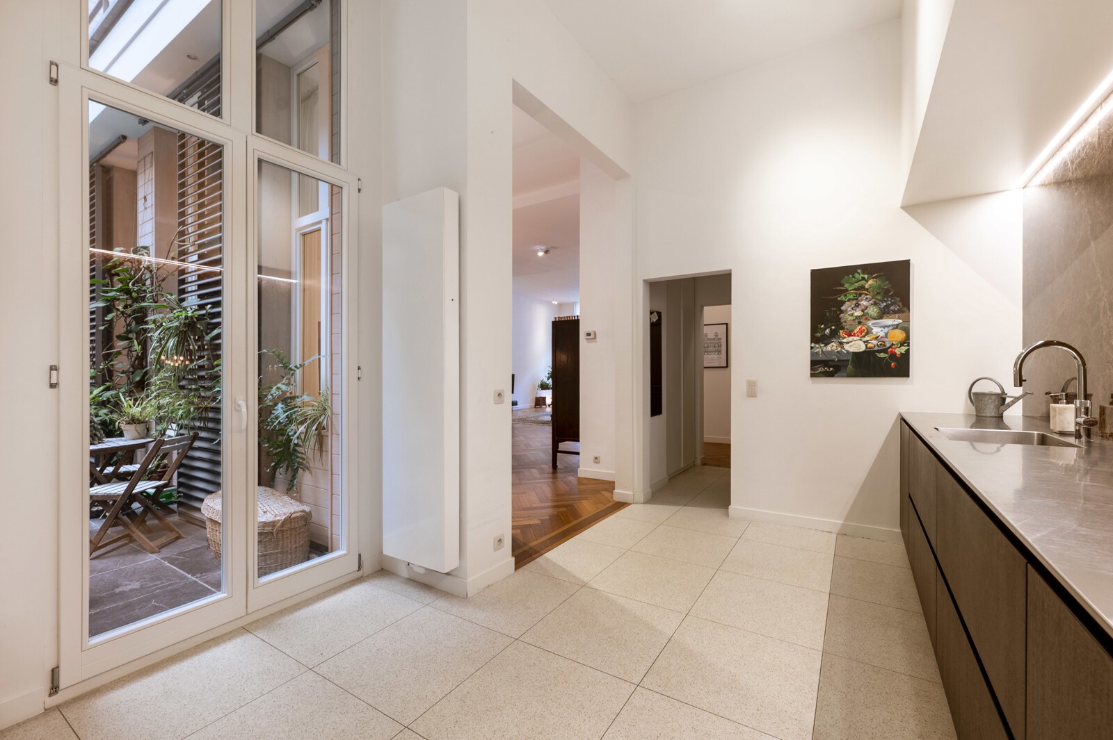 Via de inkomhal komt u in de leefruimte met een prachtige gevelbreedte en hoge plafonds. Deze open ruimte geniet van lichtinval aan twee zijden en biedt toegang tot een gemeenschappelijke binnenkoer. Verder een volledig ingerichte keuken met quooker kraan en de verdere gebruikelijke toestelling alsook voldoende kastruimte. Aansluitend is er een apart gastentoilet. Voor thuiswerk is er een afsluitbare bureauruimte dewelke verbonden blijft met de leefruimte. Het leefgedeelte is opmerkelijk royaal en voorzien van een visgraat parket.