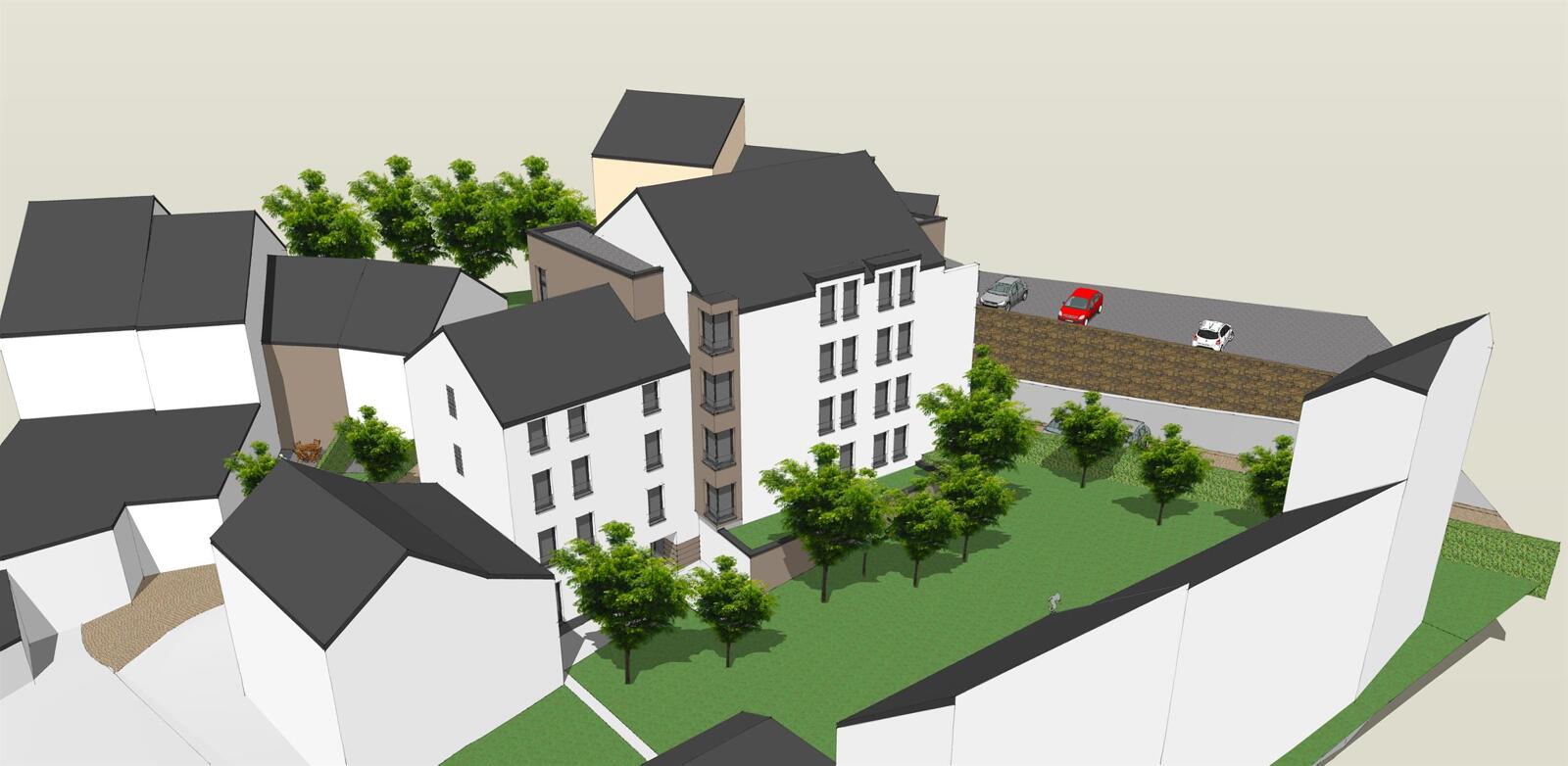 Bouwperceel van ca. 387m2, straat breedte 13,30m voor de mogelijke realisatie van 11 appartementen, één commercieel gelijkvloers, vier autostaanplaatsen en zeven kelderbergingen.