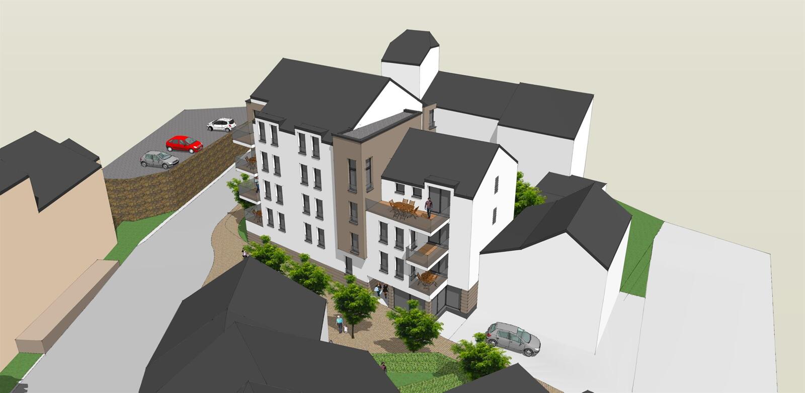 Bouwperceel van 387m2 voor 11 appartementen met commerciële ruimte en parkeergelegenheid. Plannen beschikbaar voor het volledige project. Neem contact op voor meer informatie: 03 227 06 36.